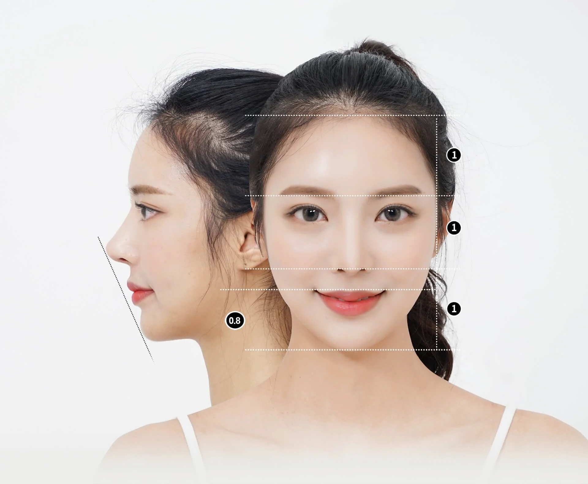 When receiving a jaw reduction surgery, the ‘golden ratio’ of faces consists of a 1:1:1 ratio of space between the forehead to eyebrows, eyebrows to nose tip, and nose tip to chin. Also, when drawing two straight-down parallel lines from the nose tip and from the chin, the chin should extend out 0.8 times as much as the nose.