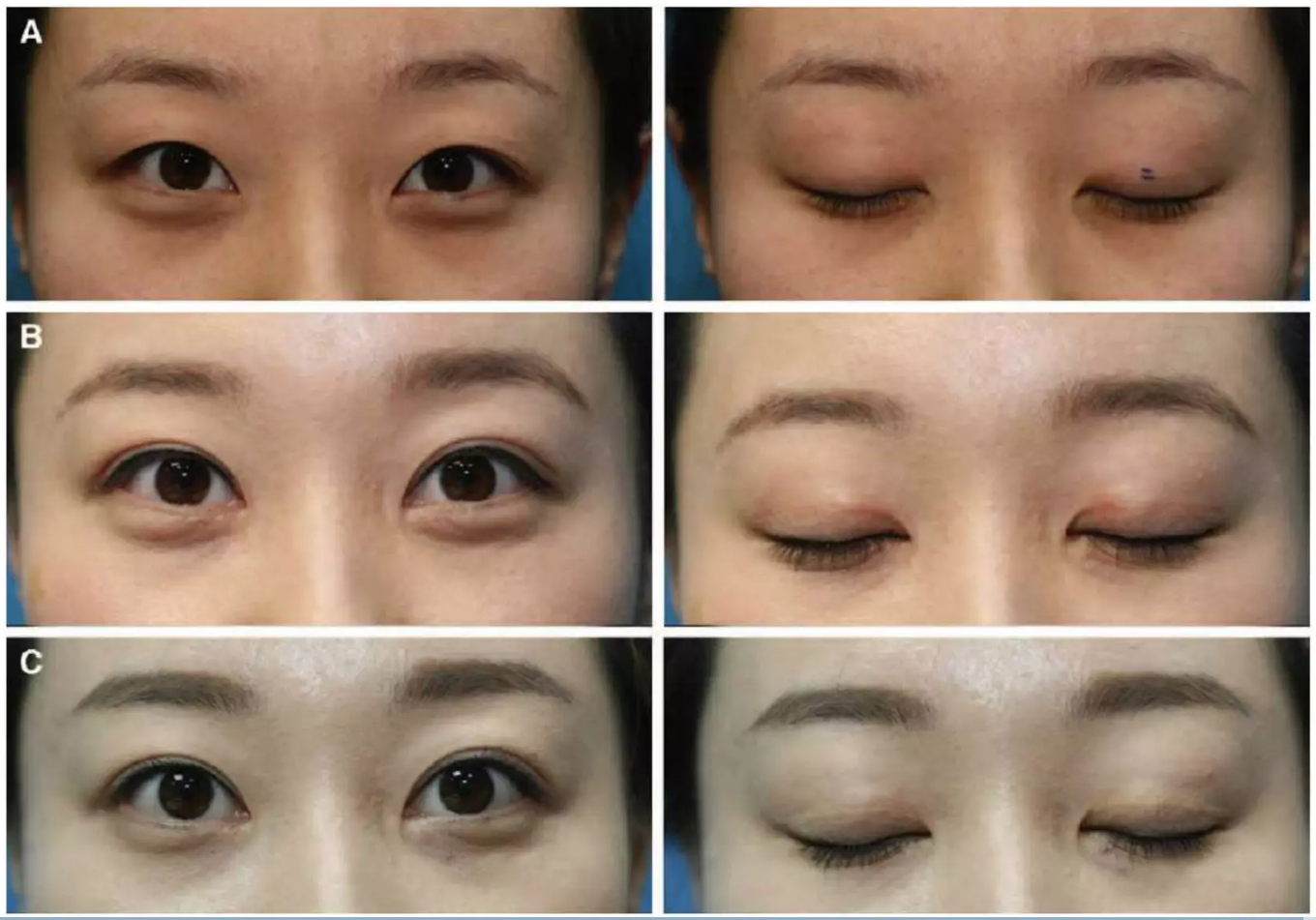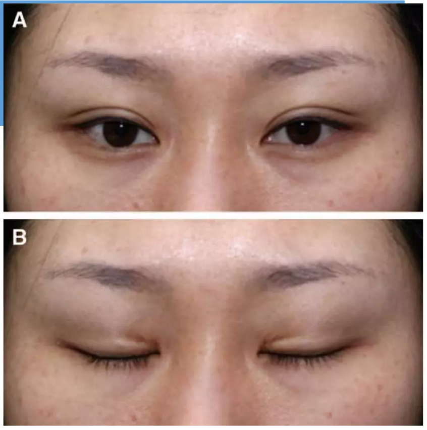 Example of Septo Aponeurosis junctionial thickening. Notice how when the eyelid is closed, the double eyelid is curved more naturally or is less noticeable compared to that of tarsal fixation.